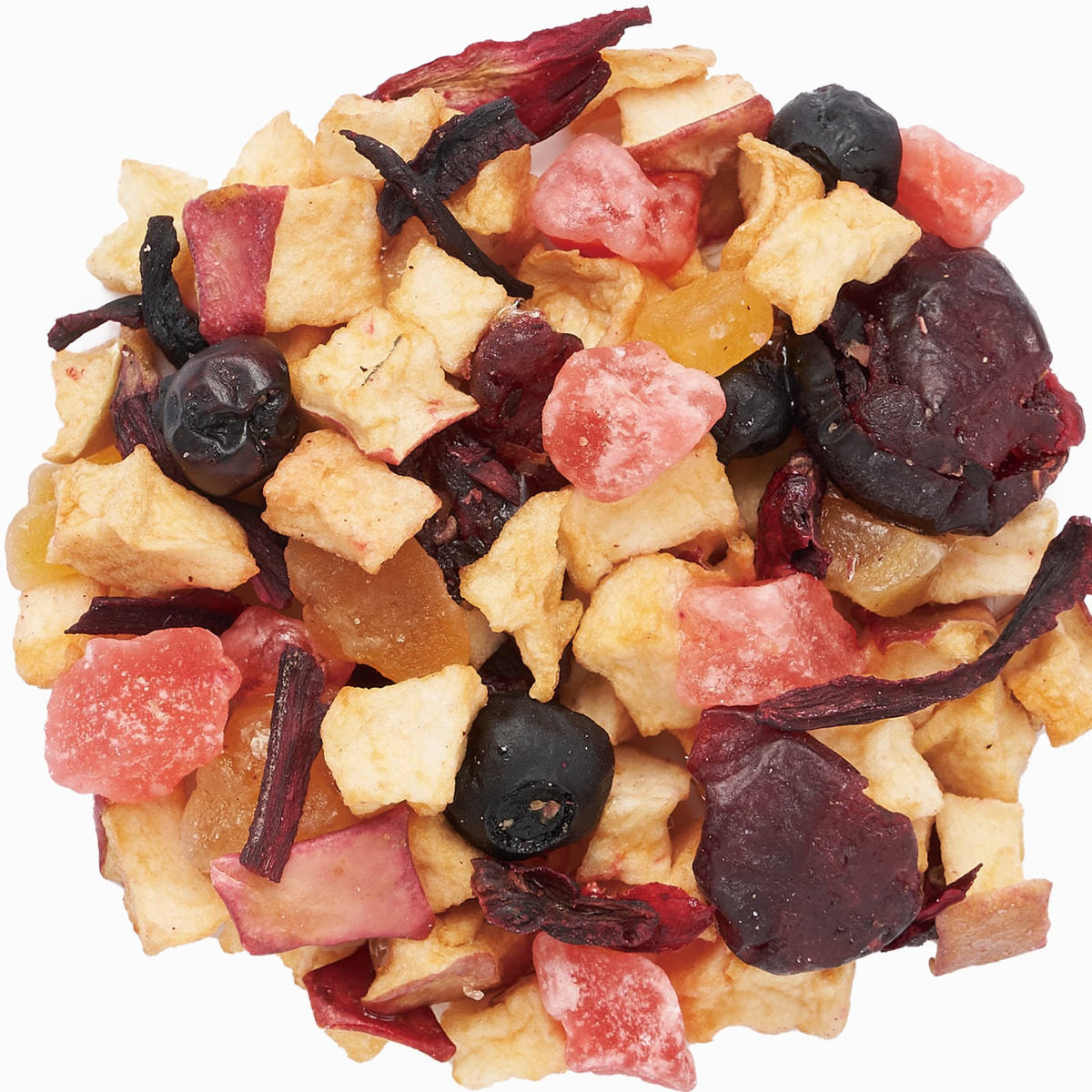 有機ドライアップル(オーストリア製造)、加糖ドライストロベリー、加糖ドライマンゴー、加糖ドライブルーベリー、加糖ドライクランベリー、有機ハイビスカス/香料、クエン酸、リンゴ酸、保存料(亜硫酸塩)、着色料(赤40)